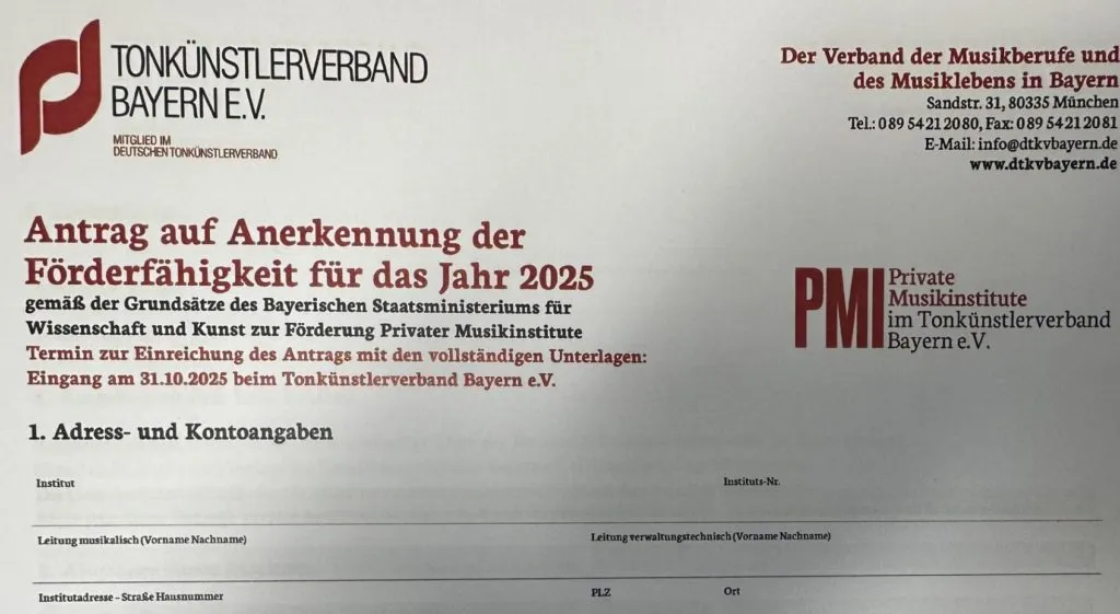 Termin zur Einreichung: 31.10.2025! Der Antrag auf Anerkennung der Förderfähigkeit für das Jahr 2025 gemäß der Grundsätze des Bayerischen Staatsministeriums für Wissenschaft und Kunst zur Förderung Privater Musikinstitute ist ab sofort online. Ebenso sind alle erforderlichen Informationen auf der Website ersichtlich. Die Förderung Privater Musikinstitute wurde neu strukturiert und die Konzeption orientiert sich eng am Inhalt der Förderrichtlinien im Sing- und Musikschulbereich. Der Tonkünstlerverband Bayern bietet verschiedene Informationsveranstaltungen zur Erklärung und Beratung der Neustruktur an: